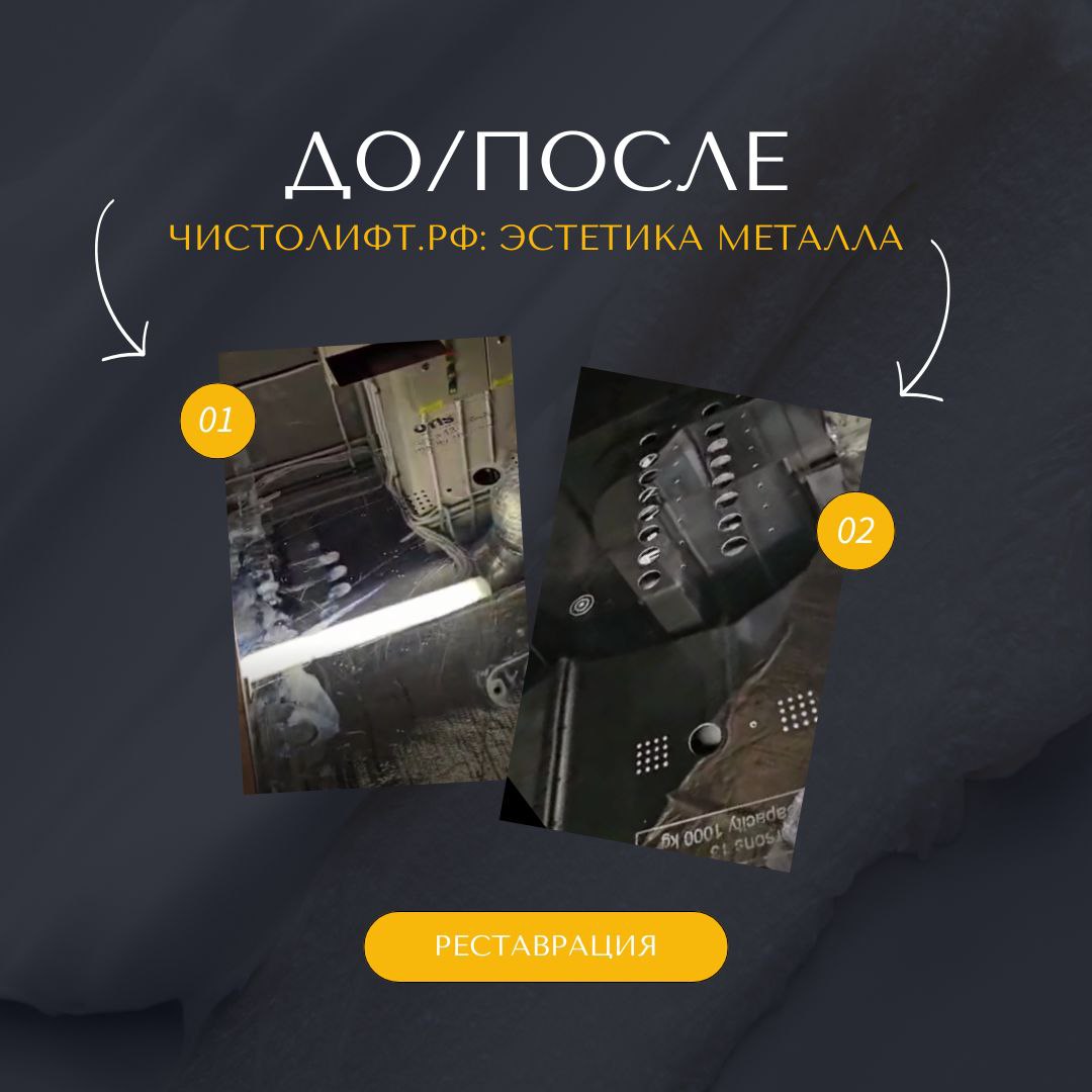 В конце мы обработали панели защитой металлического покрытия с пролонгированным эффектом для сохранения блеска и сияния металла. Запатентованная защита металлических поверхностей ЧИСТОЛИФТ выдерживает до 6 лет при эксплуатации в помещении: облегчает регулярную очистку, предотвращает истирание и развитие коррозии.