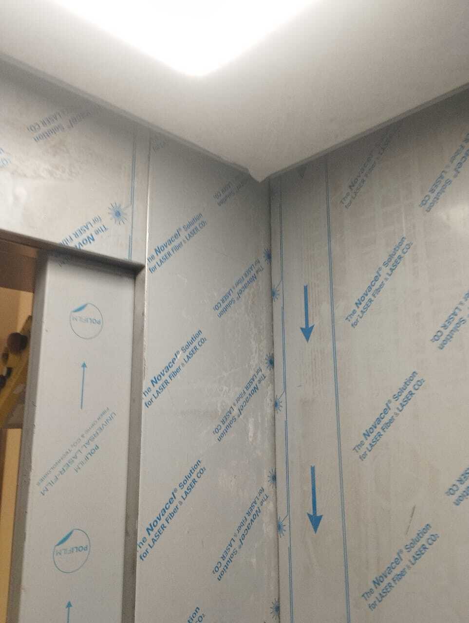 После установки лифтового оборудования на объект необходимо сразу же удалить заводскую плёнку с кабины, иначе потом это будет сделать гораздо сложнее. Клеевая основа "прикипает" к обшивке, плёнка рассыхается и начинает пузыриться от перепада температур. Если за время эксплуатации лифта на плёнке появились разрывы и царапины, которые проникли до металла, может начаться процесс окисления и коррозии.
